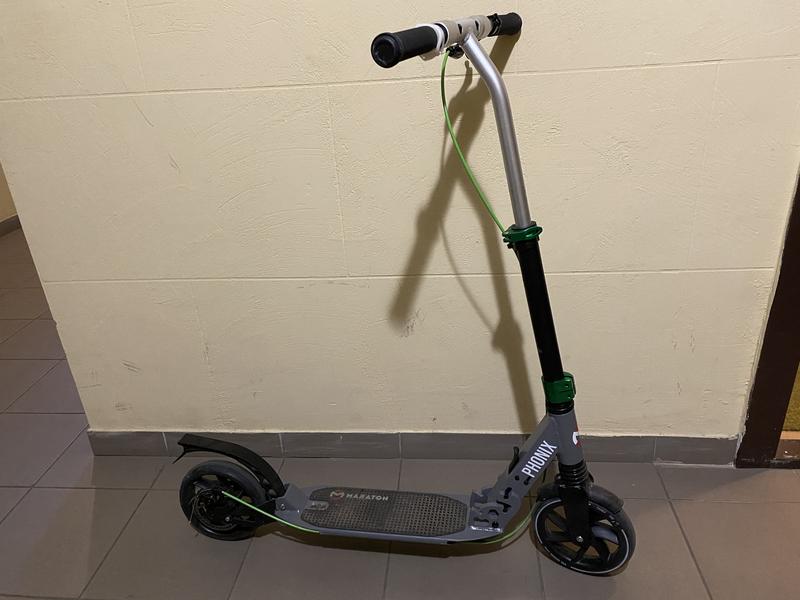 Самокат Maraton Phonix – вариант для подростков и взрослых, рассчитанный на возраст от 7-ми лет. Имеет два амортизатора и большие колеса, благодаря этому вы не почувствуете мелких неровностей и насладитесь отличной, плавной ездой. А с помощью регулировки руля вы легко подстроите самокат под свой рост. Два больших, литых колеса диаметром 200 мм, характеризующихся высокой проходимостью. Выполнены из полиуретана, отличаются повышенной устойчивостью к истиранию и износу. Для надежного торможения самокат Maraton Phoenix оснащен двумя тормозами - ножным (заднее крыло) и ручным дисковым для быстрого торможения, который установлен на рукоятке в виде удобного рычага. Прочная рама изготовлена из качественного 100% алюминия, что обеспечивает полную безопасность во время катания. Самокат имеет легкую систему складывания, благодаря чему его удобно хранить и транспортировать. Хорошую сцепку с ногами обеспечивает платформа с нескользящим покрытием. Руль регулируется в трех положениях, вы легко подберете оптимальный вариант под себя или ребенка и самокат прослужит не один год В комплекте к самокату поставляется фонарик Максимальная высота руля 108 см, минимальная 94 см. Кроме того на руле установлен специальный фиксатор, он убирает дребезжка и прочно фиксирует руль. Отличные резиновые насадки на ручках самоката – руки ребенка не соскользнут. Высокоточные подшипники ABEC: дарят самокату красивый накат и не требуют ухода Характеристики самокату: Возрастная группа – от 7 лет; Сложная конструкция – да; Максимальная нагрузка – 100 кг; Регулируемая рулевая стойка - да, 88-104 см; Размер платформы - 46х14 см Подножка – да; Количество колес, шт. - 2 шт.; Материал колес – полиуретан; Диаметр передних колес – 20 см; Диаметр задних колес – 20 см; Жесткость колес – 82А; Тормоз - ножной и ручной дисковый; Два амортизатора - передний и задний; Вес самоката – 5.5 кг; Подшипник – ABEC-9 CHROME; Материал рамы - анодированный алюминий