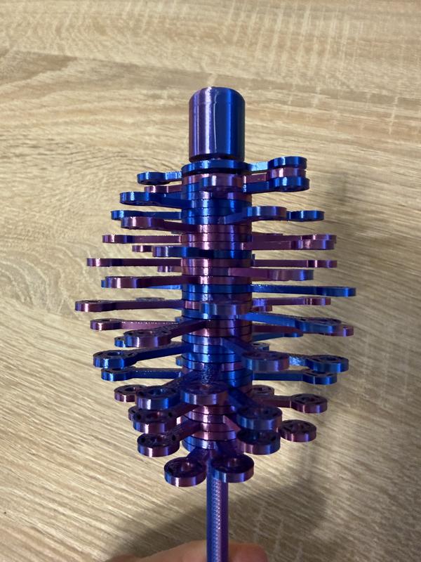 Це популярна антистрес-іграшка, яка стала справжнім хітом у світі 3D-друку. Її часто називають "Magic Spiral" або "Lollipop Fidget". Це кінетична іграшка, що складається з багатьох окремих пелюсток (пластин), нанизаних на центральну вісь. Завдяки особливій формі кожної пластини, при певному русі вони створюють дивовижні візуальні ефекти.