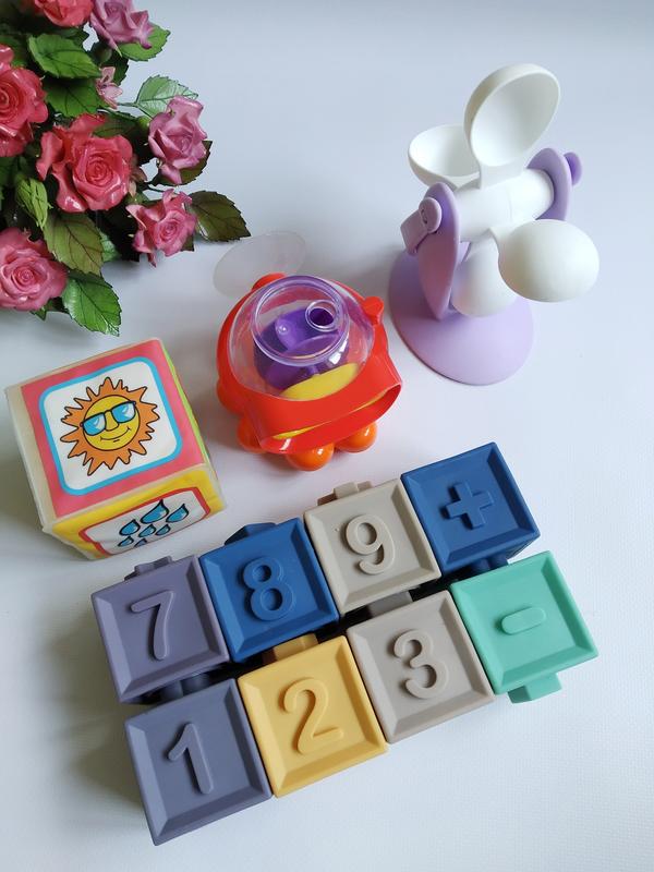 🔸Фото 2 - резиновые кубики. ‼️Некомплект. Всего 8 кубиков. Из цифр - 1,2,3 и 7,8,9. Также знаки +,-,=. Каждая грань кубика разная - это изображение животного, ягодки, цифры. Есть выпуклые части в виде квадратов, линий, точек и т.д. В каждом кубике есть выемка (треугольник, ромб, квадрат и т.д), соседний кубик имеет такую же выпуклую часть, таким образом, кубики ставятся друг на друга. ‼️Так как кубики некомплект, все кубики друг на друга не ставила, не проверяла. Состояние кубиков хорошее. Можно для купания. 🔸Фото 3 - клеёнчатый кубик. Состояние хорошее. 🔸Фото 4 - игрушка для купания. ‼️Некомплект. В наборе должно быть три разные игрушки, которые ставятся друг на друга. У меня одна. Игрушка в очень хорошем состоянии. При движении отсека для водички, у игрушки вращаются глаза. Есть присоска. 🔸Фото 6 - игрушка "водяное колесо". Игрушка в хорошем состоянии. ‼️Цена указана за лот. 🔥В наличии много других интересных игрушек, смотрите мои лоты. ☝️Перед оформлением заказа, ознакомьтесь пожалуйста с информацией в профиле. 🛑 Условия оплаты и доставки указаны в разделе "ОБО МНЕ". Спасибо что заглянули 💖