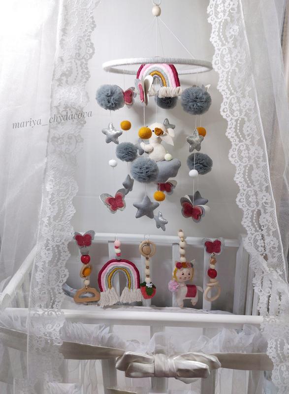 Декоративний мобільний ручної роботи з фетру. Мобіль пошитий вручну з фетру найвищої якості, а всередині кожної фігурки м'який гіпоалергенний наповнювач. Також у мобіль входять намистини з вовни австралійського мериноса, повалені вручну. Мобіль може бути виконаний у будь-якому кольоровому поєднанні. Палітра налічує понад 50 варіантів кольорів. Напишіть які кольори Вас цікавлять, прикріпіть фотографії Вашої дитячої або картинки, що просто сподобалися Вам, а я підберу для Вас варіанти квітів і разом ми створимо мобіль Вашої мрії