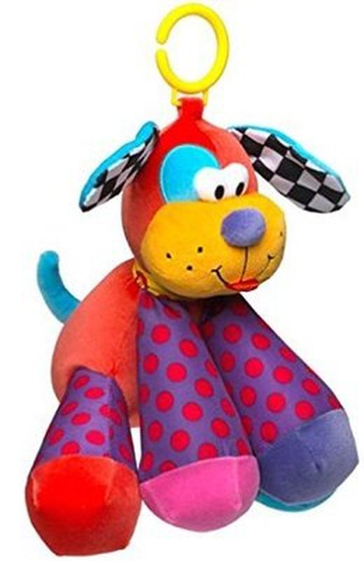 Яркая, красочная, развивающая игрушка изготовлена из мягкой велюровой ткани. Смешной щенок с удивительными лапками, каждая, имеет свою специальную нотку, при нажатии издает звуки различных тональностей. Ушки приятно шелестят. Малыш с удовольствием будет играть со щенком, она надолго привлечет его внимание, а звуки, которые издаёт подвеска будут стимулировать малыша к действиям. Щенка с помощью удобной петельки, можно запросто подвесить к коляске, кроватке, бамперу или дугам игрового коврика. Такая игрушка, способствует развитию моторики и зрения ребенка, благоприятно влияют на эмоциональное состояние малыша, способствуют развитию цветовосприятия. Изделие изготовлено из экологически чистых материалов, абсолютно безвредно и безопасно Размер около - 25.40cм х 12.07cм х 24.13cм. Подходит для любого возраста не сток, передали с Канады