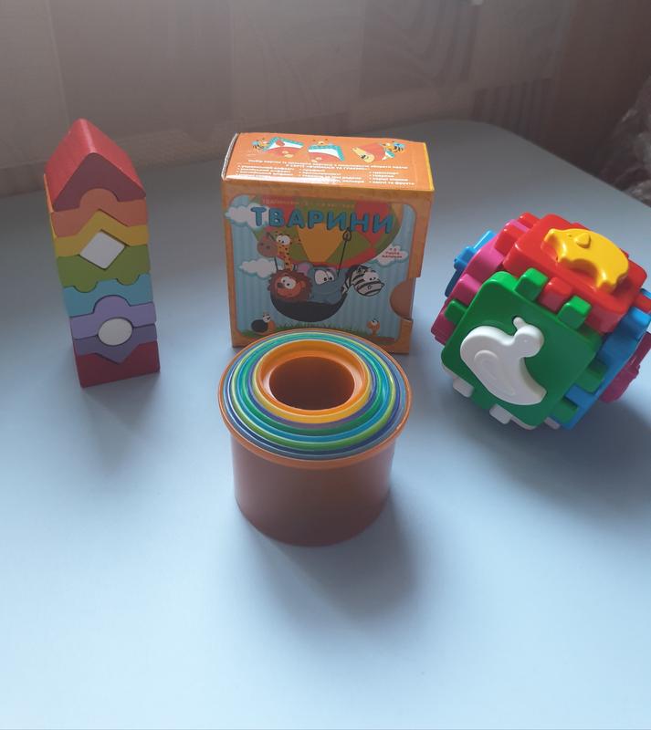 Набір іграшок, 4 шт. Картинки, цупкий картон, яскраві, цікаво вивчати тварин. Піраміда дерев'яна, багато фігурних елементів, щоб скласти її правильно слід подумати) Піраміда пластикова, на дні вказані цифри,яка фігурка за якою слідує. Кубик зі звірятами. Цікава,захоплююча головоломка. Всі деталі на місці,нічого не втрачено
