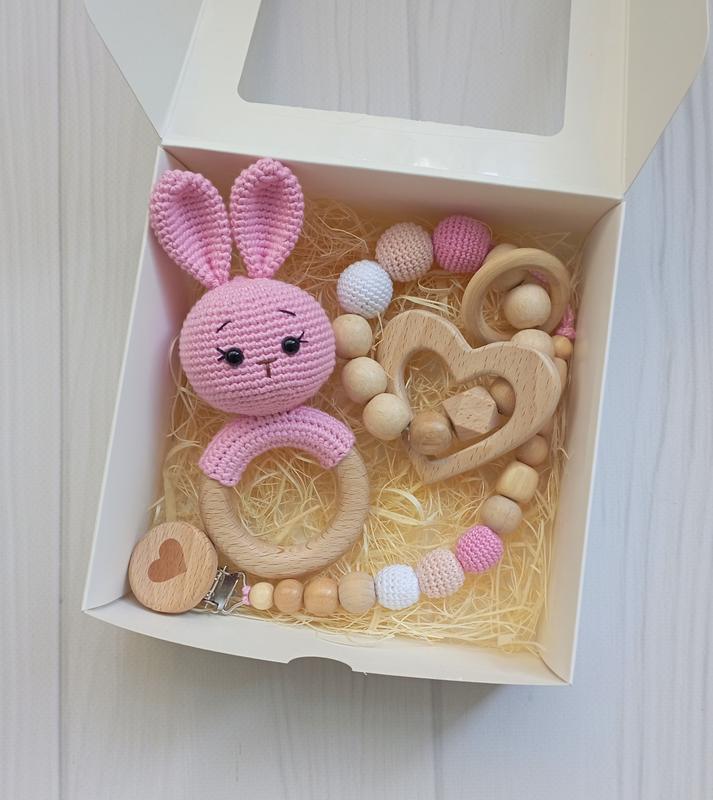 Набор с розовым зайчиком💗 В набор входит: вязаная погремушка зайка, грызунок и держатель для пустышки (грызунка) 🌿100% бавовна 🌿дерево 🌿гипоаллергенный наполнитель Оченята 🐰 на безопасном креплении Связь с любовью