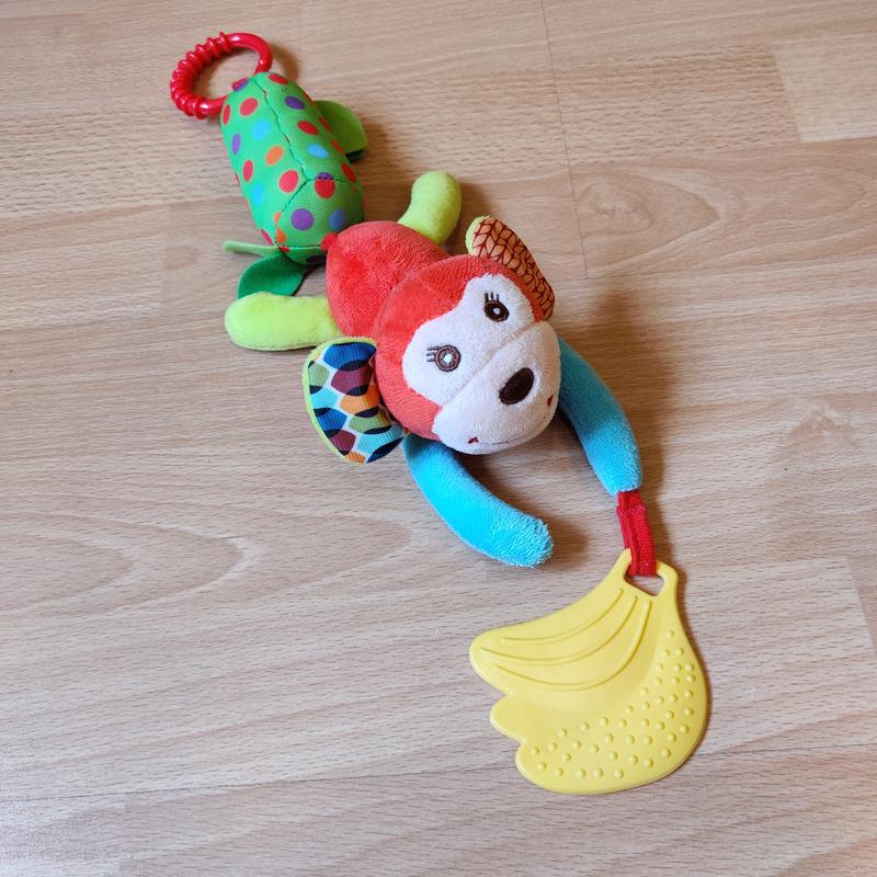 Идеальное состояние Состоит из четырех элементов: кольцо для крепления, погремушка, мягкая цветная обезьянка и прорезыватель для зубов в виде бананов Помогает развивать у ребенка мелкую моторику, эмоции, чувство познания мира. Отволакивает, занимает
