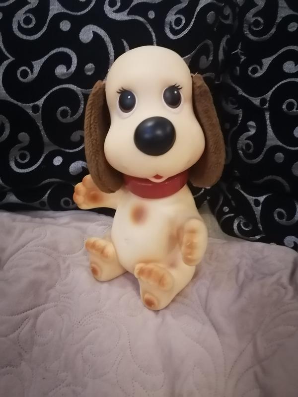 В отличном состоянии. Поворачивает головой ушами, предназначена для игр в ванной бассейне, на отдыхе рычагом поворачиваете голову и имитируете плаванье собаки.