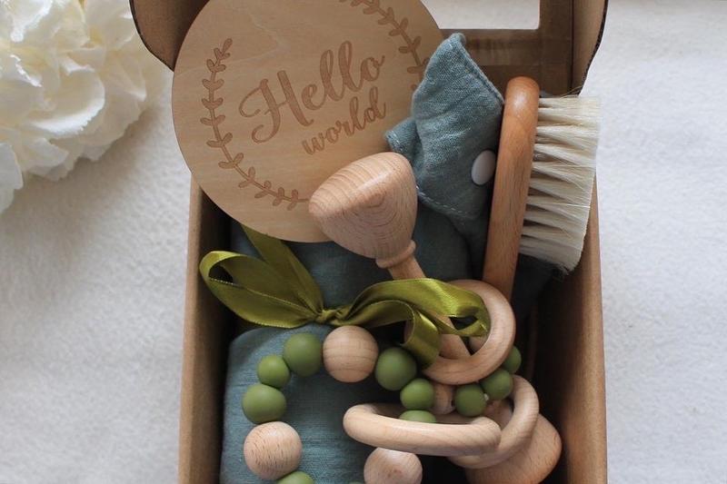 В наборі: ☁️ муслінова пеленка 🌱 нагрудник на застібках 🧸 прорізувач-іграшка handmade 🧽 щіточка для волосся 100% natural wood 🪵 прорізувач-брязкальце