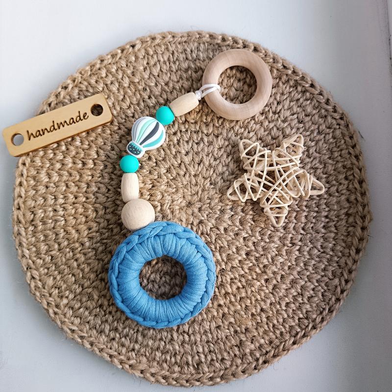 Грызунок для малыша, яркий и колоритный💚💙. За счет различных текстур (дерево,пищевой силикон,пряжа) поможет развить мелкую моторику пальцев рук, тактильную память и сенсорику👶🍼 Ручная работа 🙏