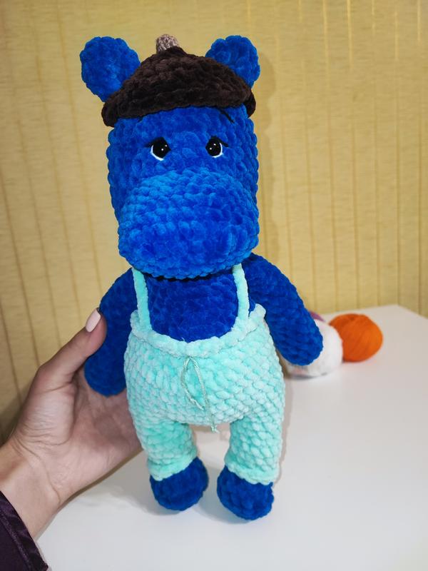 Плюшевая пряжа, дружок для вашего ребенка. полностью ручная работа, шапочка снимается. глазки на безопасном креплении, наполнитель холофайбер. Мягкий и небольшой бегемотик)
