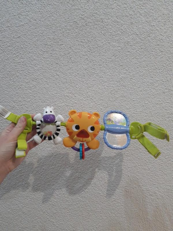 состояние очень хорошее нюанс! не могу выкрутить винт, чтобы заменить батарейки. потертости на зебре Описание Игровая панель Bright Starts Африка Игровая панель Африка – это современный способ занять малыша, когда он не спит. Ее легко можно закрепить там, где необходимо: на кроватку, коляску, автокресло развивающий центр. Крепление простое и надежное. Малыша будут развлекать сразу три интересные игрушки. Безопасное вращается зеркало, тигр с прорезивалей, нос которого загорается, если на него нажать, и играет одна из 4 мелодий, а также погремушка зебра с цветными шариками внутри.