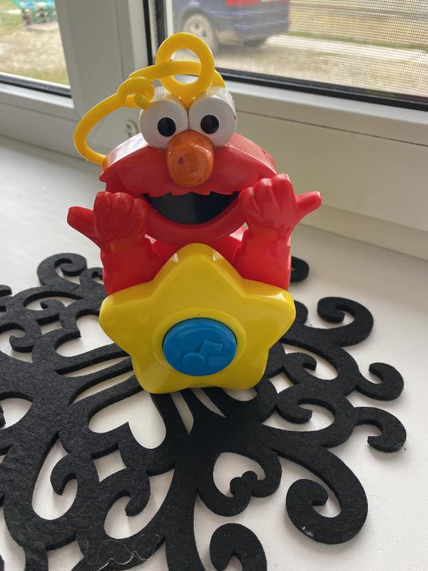 веселая игрушка подвеска для малыша. нажимая на синюю кнопочку, рот закрывается ручками, раздается смех и мелодия.