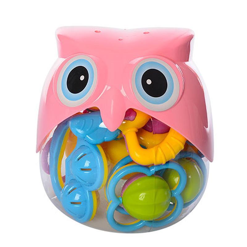 Чудовий і функціональний подарунковий набір молодим батькам для малюка включає в себе 10 брязкалець, які можна скласти в колбу у вигляді сови.