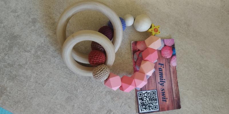 Слингобусы прорезыватель, из натуральной древесины, с тремя кольцами. Бусины, обвязанные хлопковой нитью. Хорошая упаковка в подарок.