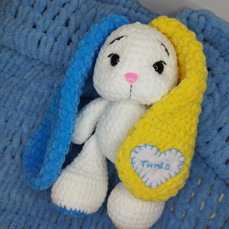 зайчик вязаный из гипоаллергенной пряжи, глаза на безопасном креплении. цвет можно выбрать на ваш вкус. также одежду, размер ушек. имениная нашивка.