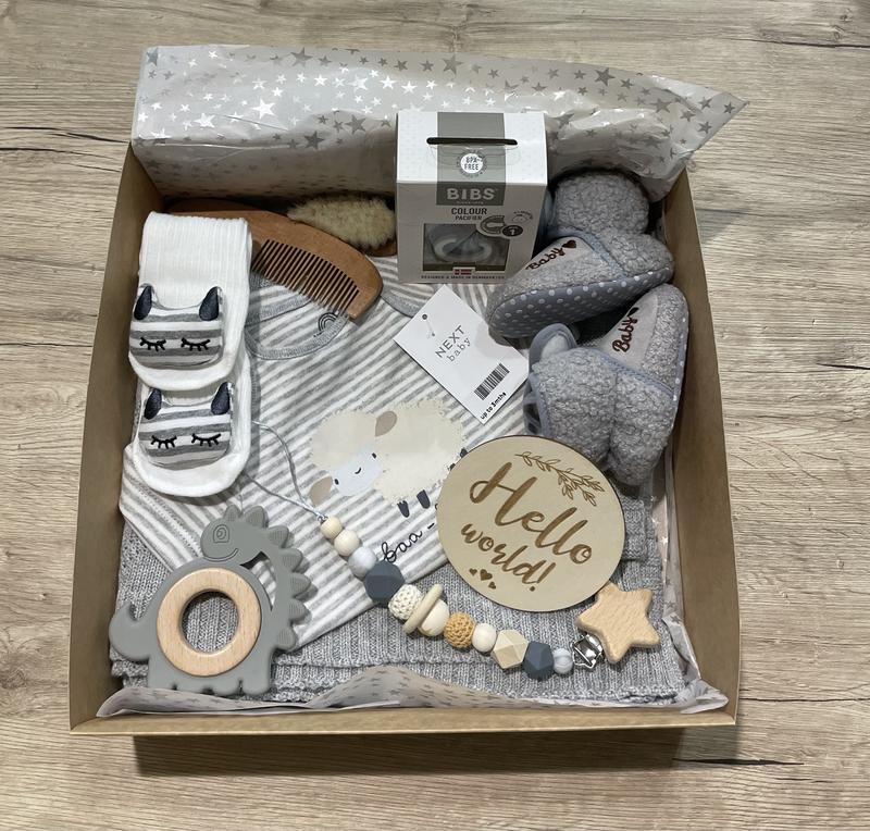 Подарунковий бокс в універсальному сірому кольорі. До набору входять: 1. Бодік з коротким рукавичиком 56-62 см next ❌ Сертифікована найякісніша пустушка BIBS ❌ Вʼязаний сірий плед 90*70 ❌ (такого що на фото нема, є інший вʼязаний такого самого кольору, але більш плотний, запитуйте) ціна в оголошенні вказана за бокс без пледа Шкарпетки з котиком ❌ (є інші варіанти шкарпеток, запитуйте. Ціна за бокс в оголошенні вказана без шкарпеток) 2. Тепленькі пінетки чобітки для найменших ніжок 3. Тримач для пустушки 4. Силіконовий гризунець з деревʼяною втулкою дракончик Набір деревʼяних гребінців найвищої якості ❌ 5. Деревʼяна картка для фотосесії Досі шукаєте ідеальний подарунок молодим батькам? Ми його вже підготували! Деталі боксу можна змінювати за Вашим бажанням!