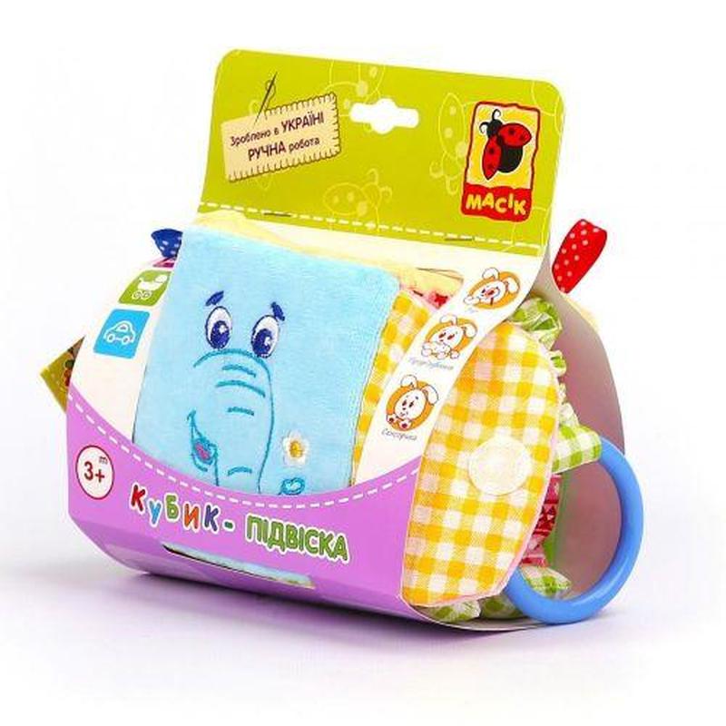 Кубик-підвіска "Слон Мілаш". Рознімні кільця, безпечне дзеркало, шелестить, зручний прорізувач. Рознімне кільце дає змогу підвісити іграшку на коляску, на ліжечко або на автокрісло. Ручна робота.