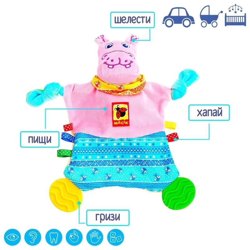 Детская игрушка прорезыватель "Зоо Бегемот Домяк" Macik Мягкая развивающая игрушка-обнимашка с прорезывателями. 0+ Ребенок обнимает игрушку во сне, и можно намазать маминым молоком и тогда это хороший анти стресс. 3 — 5 месяцев: Игровые элементы: пирожные, шуршащие ушки, лапки-узлики, красочные шлевки - тренируют мелкую моторику, развивают слух, зрение, тактильное восприятие. От 5 месяцев: Рельефные прорезыватели на лапках мягко массируют десны – снимают боль и отвлекают от неприятного ощущения, когда режутся зубки. От 1 года и старше: Бегемотик становится первой игрушкой для ролевых игр. Игрушка-прорезыватель легкая и нежная, как маминая касания. Ребенок с удовольствием берет ее с собой в кроватку, коляску, манеж. Материалы натуральные и слюно-поглощающие. Можно стирать в машинке.
