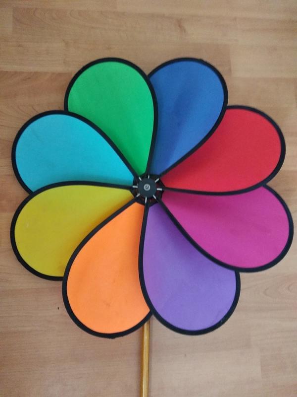 Большая красивая яркая игрушка - пропеллер для ребенка. Крепкая конструкция из сталистой проволоки и ткани. Очень легко крутится при легком потоке ветра. Размер - 48 см.