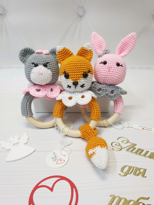 Стать: Унісекс Вік: До року Кілька примірників у наявності Ця іграшка приємна на дотик.Окуляри на безпечному кріпленні(по бажанні можуть бути вишиті). Колечко букове 70мм . Всередині гримілка. Звірятка можуть бути різні,за вашим побажанням. Звертайтесь. Буду рада зробити іграшку для вашого малюка. Зроблено з любов'ю.