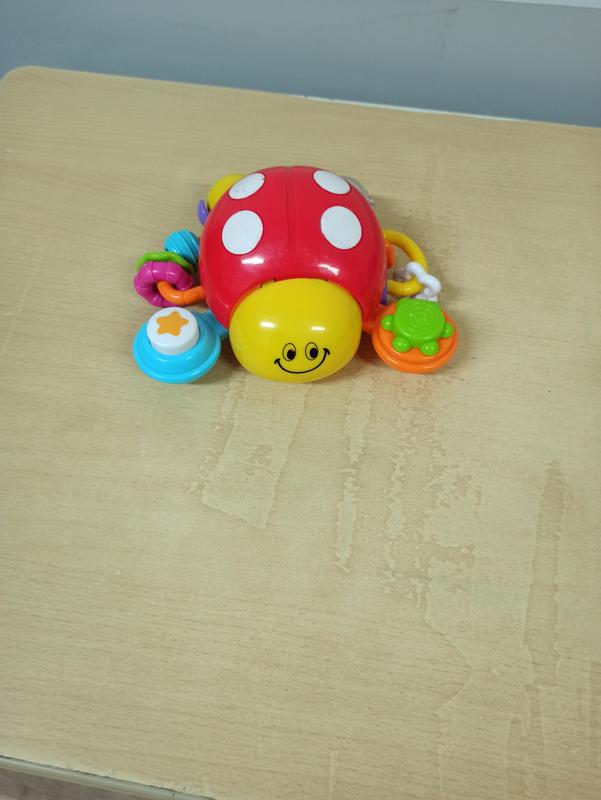 Музыкальная погремушка Божья коровка, погремушка, музыка, Благодаря инерционному механизму игрушка умеет перемещаться по ровной поверхности, просто нажмите на спинку солнышка и она начнет двигаться. В игрушку дополнительно встроена погремушка с маленькими шариками, разноцветные рельефные кольца на дуге и вращающийся цветочек со звуком