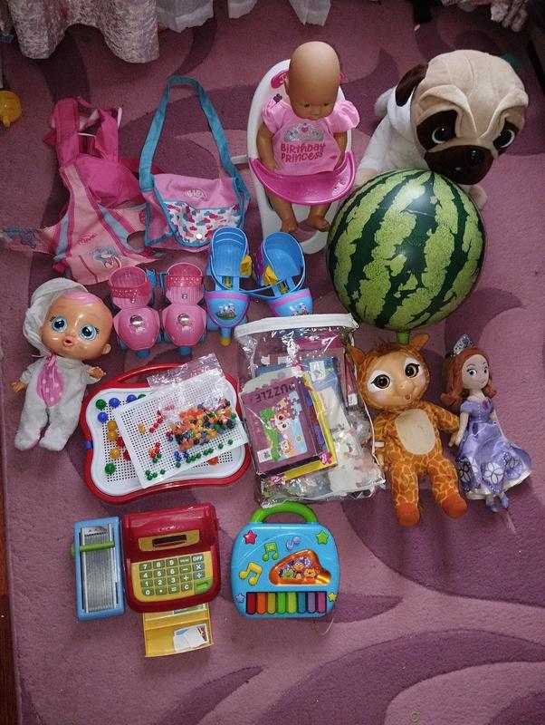 ціни різні ролики 350грн касовий апарат 120 з музикою лялька край 550грн стільчик для кормления+лялька 400грн сумка беби берн+кенгуру по 200грн мозаїки 2шт. 150грн м'яч арбуз 250гр собака мопс 250грн жираф музикальний 350грн Ельза 100грн пазли всі 100грн пианино+телефон музикальний 300грн 2в 1