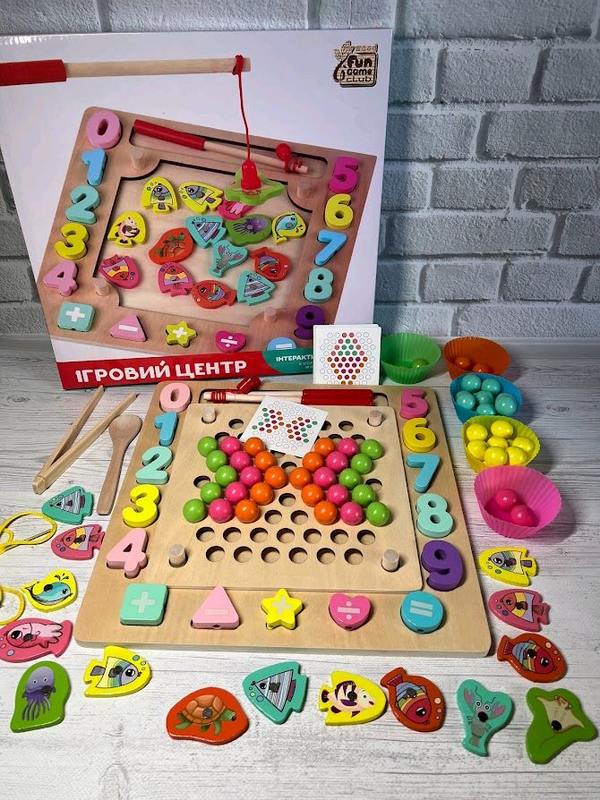 Стать: Унісекс Вік: 2 роки Кілька примірників у наявності Унікальна комплектація цього набору дасть змогу вашому малюкові грати в неї довгі-довгі місяці! У коробці 33,5*32,5*5 см У комплекті 90+ деталей і кілька ігор: Мозаїка: дерев'яна основа та 60 різнобарвних дерев'яних кульок із формочками відповідних кольорів. Для сортування і викладання мозаїка в комплекті є дерев'яні щипці та ложка, а також інструкція з прикладами картинок! Магнітна риболовля: у комплекті 15 рибок із магнітами та 2 вудки Цифри + шнурівка: у наборі 10 дерев'яних цифр і шнурочок, необхідний для того, щоб легко вибудовувати, наприклад, правильну математичну послідовність цифр) Геометричні форми та знаки: все з тим же шнурочком і вже плюс математичні знаки можна вчитися додавати та віднімати. Крім того, "носія" знаків — це основні геометричні фігури! Завдяки вдалій і дуже продуманій комплектації набору, Ваша дитина й в 1 рік, і в 5, і 6 років захоплено в неї гратиме! Адже кульки можна й сортувати, а ставши старшим їх вважати, складати комбіпримери з кульок і цифр, вигадувати складні мозаїчні малюнки та ін!