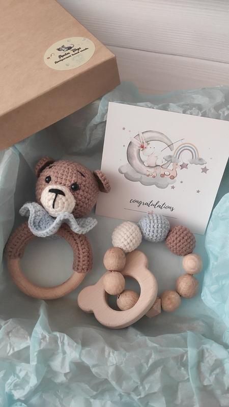 Подарок на крестины, мишка, калатушка, прорезыватель, мишка ручная работа, вязаная игрушка