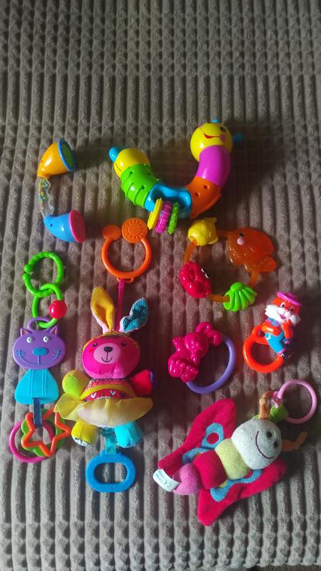 Игрушки для малыша в хорошем состоянии, без дефектов. Подвески на коляску или кроветочку - 3шт. погремушки -4шт. гусеница -4в1.