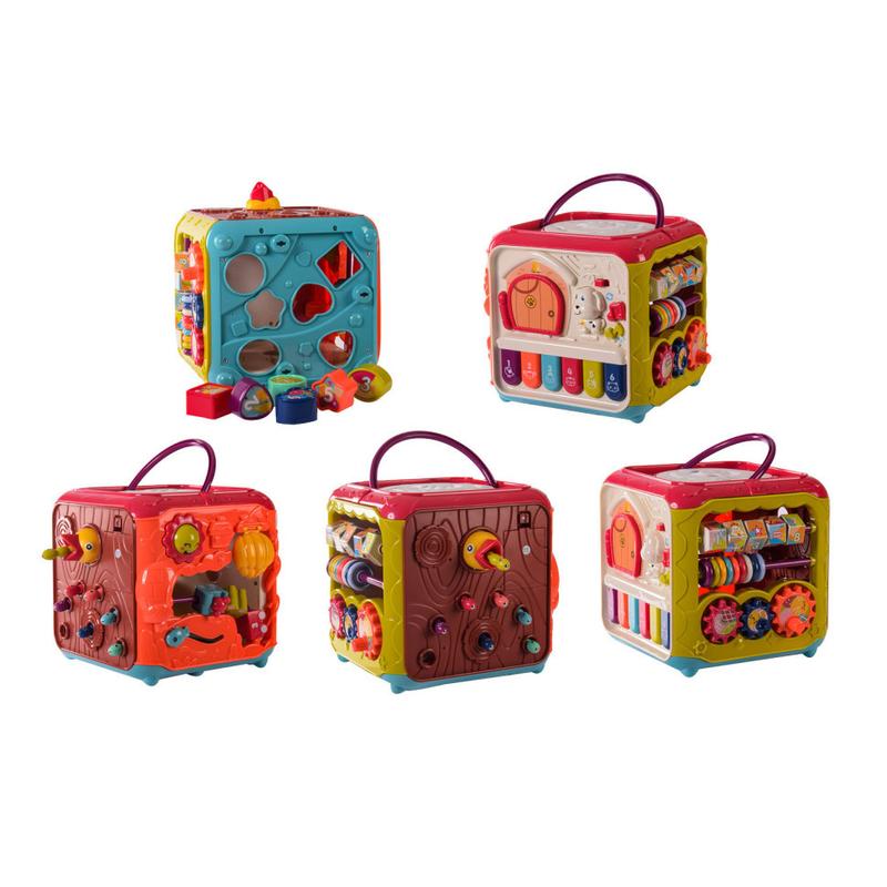 Развивающая игрушка Бизикуб Bambi 648A-58 на батарейках топ Бизи-куб состоит из шести граней с разными игровыми элементами. В нем есть музыкальные клавиши, барабан с подсветкой, сортер с разными геометрическими фигурами и магнитная игра «поймай червячка». Суть игры с червячками проста: с помощью совы с магнитом на клюве нужно поймать всех разноцветных червячков.Играшка помогает развить у ребенка мелкую моторику, координацию движений, воображение, а также знакомит с цветами. В комплекте: - сова- неваляйка с магнитом на клюве - червячки на магните Функции: - нотные клавиши - детские песни - забавные звуки разных животных - веселые мелодии - голоса животных - дверца открывается со скрипучим звуком - пальчиковый лабиринт с тремя пронумерованными вагонами - вращающийся шарик с бусинами - вращающиеся шестерни - барабан с подсветкой - магнитная рыбалка с червями - свет Размер игрушки 19*19*19.5 см Батарейки 3 шт. типа АА (в комплект не входят)