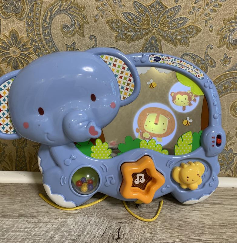 Інтерактивне дзеркало від VTech. Натисніть або потягніть зірку, і в дзеркалі чарівним чином з’являться мавпа та лев Поворотний метелик відтворює різноманітні грайливі звуки, заохочуючи розвиток моторики. Сортувальник форм і роликовий м'яч допомагають розвивати дрібну моторику. Призначене для дітей від народження.