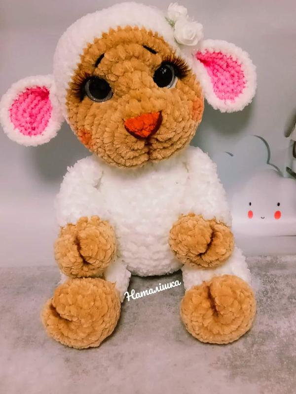 Овечка изготовлена из мягкой ниточки софти и плюша.Меет высоту 40см.Надам видео при необходимости.Голова на суставе,крутится.Очи на безопасном креплении.Игрушка безопасна для маленького ребенка