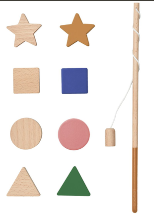Игра на рыбалку в Ливуде, которая состоит из следующего: Удочка с магнитом на конце 2 звезды 2х квадраты 2 х круги 2х треугольники Игра «Рыбак в Ливуде» очень весела и подходит даже для самых маленьких. Удочка имеет магнит на конце, а все предметы имеют магнит посередине, чтобы их можно было поймать на удочку. Рекомендуемый возраст: 2 года + Размеры: Удочка: 30 см Круг: 4 х 1 см Изготовлен из: - 100% дерева