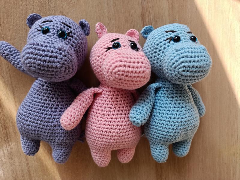 Милые цветные бегемотики ручной работы. Все в наличии. Гарантируют владельцу хорошее настроение и улыбку. Игрушки связаны из хлопка, глазки на безопасном креплении, наполнитель - холлофайбер. Рост малышей - 14 см. Для маленьких ладошек.