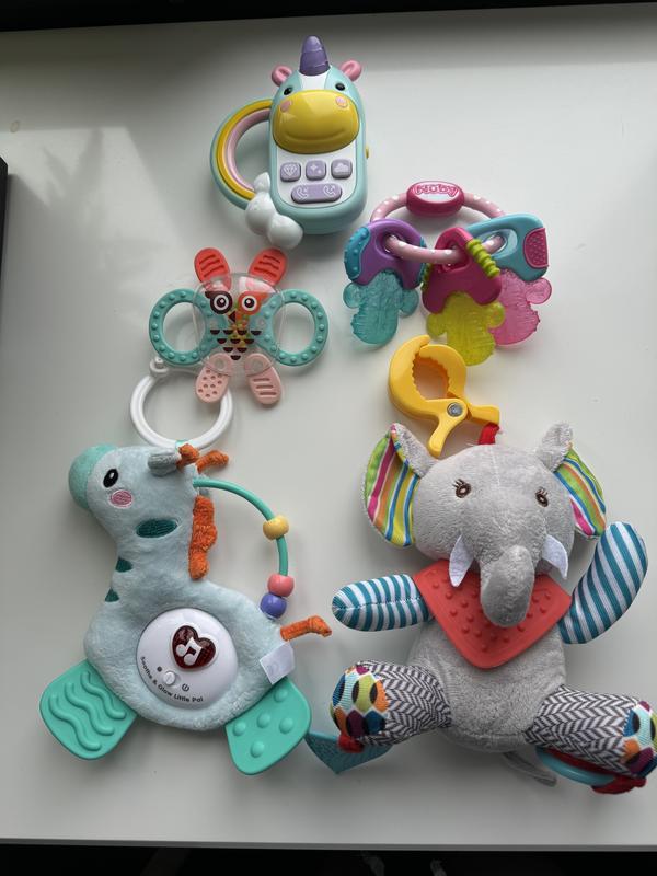 Игрушки для малышей в отличном состоянии. 1. Музыкальный телефон единорог Skip hop 300 грн. Кнопки играют звуки, большая кнопка-нис играет музыку. 2. Погремушка 100 грн 3. Грызунок Nuby 100 грн 4. Игрушка-грызунок с песнями на укр языке. Играет 2 песни. 350 грн. 5. Брязкальце слоник. Taf toys Ушки шуршат, есть два колечка грызунка, мелодически звенит если потрясти. 300 грн