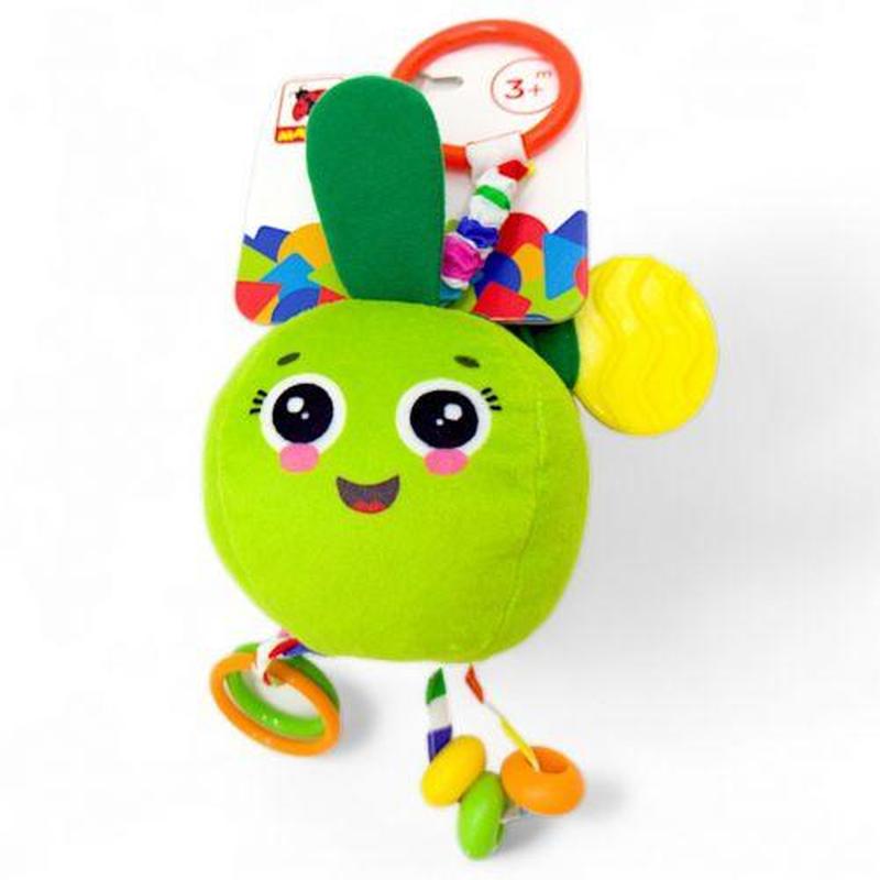 Подвеска-погремушка на кроватку или коляску с мягкой игрушкой и тарахтелкой внутри. Длина подвески – 33 см, размер игрушки 9х9х9 см. Выполнено из качественных и безопасных материалов, игрушка мягкая и приятная на ощупь. К игрушке также прикреплены пластиковые колечки разного размера и прорезыватель. Подойдет детям старше 3-х месяцев.