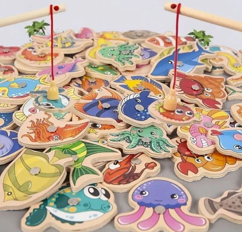 Магнитная деревянная игра Рыбалка Развивает моторику рук ребенка, яркие цвета деревянных морских обитателей вызывают интерес у малышей Комплектация: 1) Одна удочка, 15 рыбок 169 грн 2) Две удочки 31 рыбка 269 грн Игра идет упакована в пакеты, без коробки
