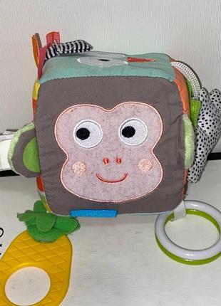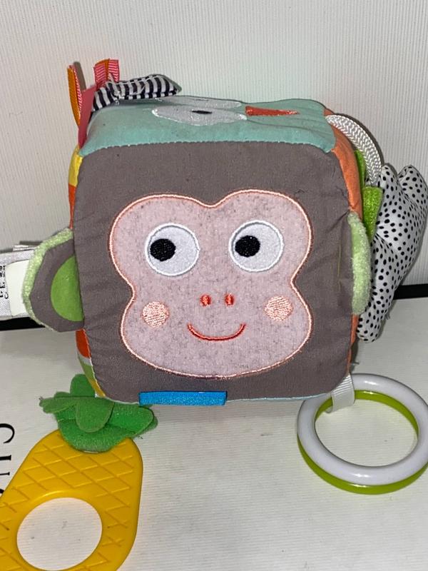 Кубик Taf Toys занимает внимание и руки малыша дома и на прогулке. Благодаря удобному колечку-карабину вы легко прикрепите игрушку к коляске, кроватке или манежу. Внутри кубика — колокольчик, - звук как у куклы матрешки неваляшки раньше был Посмотрите, сколько интересных для крохи предметов собрано в одном мягком кубике! Здесь есть: удобный прорезыватель для зубов, приятная на ощупь ручка из ткани, безопасное зеркальце, яркие ленточки, удобные для захвата маленькими пальчиками пластмассовые колечки, весёлые мордочки совы и мартышки с торчащими ушками, радуга с белым шуршащим облачком, аппетитный тканевый кусочек арбуза и даже хвостик ананаса с пушистыми зелёными листиками. И все это можно мять, кусать, щипать и дёргать, получая несказанное удовольствие. Сколько положительных эмоций и восторга для маленького первооткрывателя! При этом взрослые могут не опасаться за здоровье своего любимого шалуна, так как все элементы выполнены из безопасных материалов. Параметры товара: куб 95х95х95 мм, прорезыватель 75х55 мм, Рекомендованный возраст: от 3 месяцев Вес: 0,12 кг.