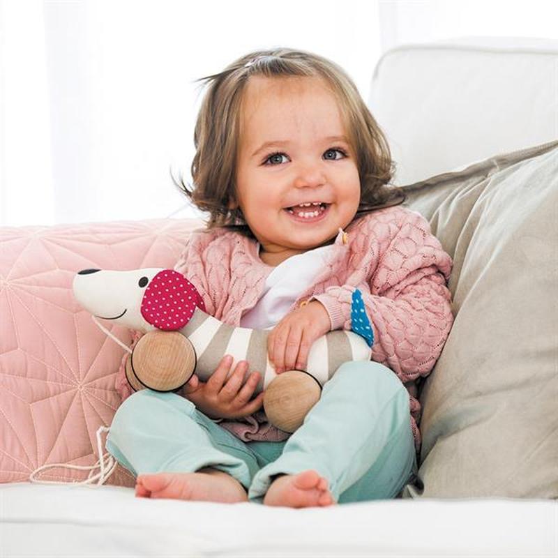 Возьмите этого милого щенка на прогулку! Когда вы закончите гулять, можно легко снять гладкие деревянные колеса с резиновыми ободками и обниматься с мягким текстильным другом. Этого компаньоном можно потянуть за веревочку, и он будет радостно покачиваться, шевеля ушами. Отсоедините колеса, и собачка станет мягкой игрушкой для обнимашек. Игрушка-каталка Hape Мягкая собачка для детей от 1 года изготовлена из тканей с разными веселыми принтами. Особенности Возраст: 12 месяцев и старше. Размеры: 31 х 18 х 13 см. Съемные колеса.