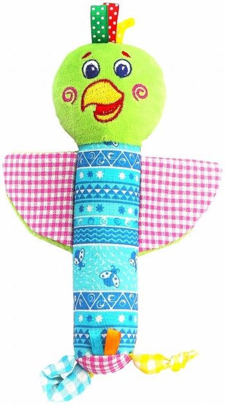 Развивающая игрушка для детей от 3 месяцев. Мягкая погремушка «Попугай» в форме палочки. Ребенку легко держать ее в руках и самостоятельно исследовать. Все элементы игрушки сделаны с целью развития органов чувств: Шелестящие крылышки и пищалка способствуют развитию слухового восприятия; Тянучки, узелочки, хохолок из ярких петелек развивают мелкую моторику, благотворно влияющую на формирование речи; Узоры, приятная разнофактурная ткань и добрая мордашка попугая тренируют концентрацию внимания, развивают зрение и дарят положительные эмоции от знакомства с окружающим миром. Материалы игрушки безопасные и хорошо впитывают слюну. Во время прорезывания зубов (от 6 месяцев) погремушку можно смело жевать.