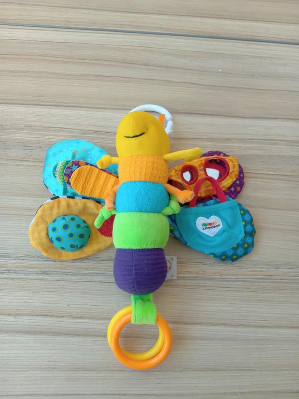 Мягкая игрушка-подвеска Lamaze Бабочка. У этой дружной насекомые велюровое тело с множеством ярких цветов, узоров и фактур, стимулирующих все органы чувств новорожденного. В многослойных крыльях есть зеркало и несколько разных на ощупь текстильных складок, которые побуждают ребенка исследовать. В игрушке есть поброская пустышка, поброничная колечка, привязанная грызунок в виде жука солнышка и узкие усики, идеально подходящие для жеваний. У игрушечной бабочки красочные цвета спереди и контрастные черно-белые рисунки на обратной стороне. Зацепка Lamaze позволяет прикрепить бабочку к коляске, кроватке, чтобы брать с собой. Состояние очень хорошее, но имеет отрезанный грызунок Цена: 100 грн