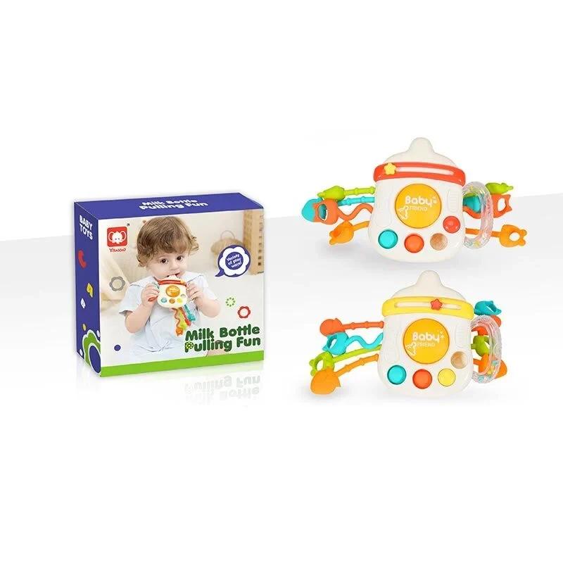 Оригінальне брязкальце для маленьких дослідників, яких дуже цікавить навколишній світ. Брязкальце відкриє малечі світ нових тактильних відчуттів та сприятиме розвитку дрібної моторики ручок. Іграшка представлена у формі пляшечки, яка містить 4 забавки: пальчикову гру з пересуванням кульки, Pop it та гумові шнурочки з текстурною поверхнею та кольорові кульки. Особливості:- виконане у формі пляшечки;- 4в1: пальчикова гра, дзвінкі кульки, гумові шнурочки, Pop it;- гармонійне поєднання пастельних відтінків;- прорізувач;- основа-платформа іграшки виконана з первинного пластика, безпечного для дітей;- ігрові елементи виконані з м’якої гуми;- сприяє розвитку дрібної моторики рук, тактильного та зорового відчуття.