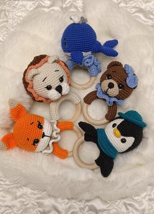 Погремушка ручной работы, вязанные крючком. Игрушки ручной работы для самых маленьких. Подарят вашему ангелу улыбку и радость. Выполнены из турецкой и итальянской пряжи, глазка на безопасном креплении, внутри гремелка, кольцо деревянное. Левко, Лисичка, Пингвинчик, Мишка, Китенок. Размер 13 см. Сделано с любовью.
