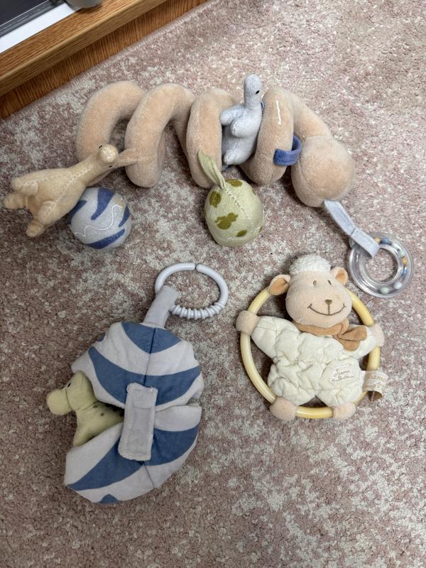 Найкращий набір який у нас був , а в нас багато іграшок . До 9 місяців малюк цікавився . Брязкальце дзвенить, яйце відкривається та шуршить, підвіска має динозаврики та яйца, а також брязкальце . Шуршать , відлітають , мають обʼєм , брязкальце - взагалі окремий вид насолоди навіть для дорослого . Дуже зручний !!!! Впевнена, будете задоволені покупкою .