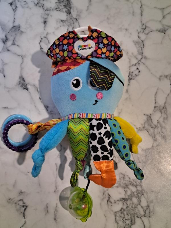 Мягкая игрушка-подвеска Пират осьминог с прорезывателем предназначена для детей с рождения. У этого пирата-осьминога восемь узловатых конечностей, которые отлично подходят для исследования. В игрушке есть скрытое зеркало, которое помогает малышу научиться узнавать себя и фокусировать внимание. Ребенок откроет для себя разные звуки от погремушки, колец, шляпки, которые являются идеальными для развития слуха и тактильных ощущений. Мягкая игрушка-подвеска Пират осьминог имеет универсальную зацепку, которую можно прикрепить к коляске, кроватке или сумке для пеленок, чтобы путешествовать с вами куда угодно. Батарейки не нужны. ОБЩАЯ ИНФОРМАЦИЯ: Бренд Lamaze Категория Игрушки Подкатегория Игрушки на коляску и кроватку Страна регистрации ТМ США Страна производства Китай Материал Текстиль, пластик Пол Для девочек, для мальчиков Тематика Сенсорика Возраст детей от, мес. 0 Возраст детей до, лет 1,5 Возраст. группа Грудной возраст Цвет разноцветный РАЗВИТИЕ: Прикосновение Зрительно-моторная координация Распознавание цветов Слух РАЗМЕР И ВЕС ТОВАРА Ширина, см 13 Глубина, см. 10 Высота, см 25 Вес, кг 0,11