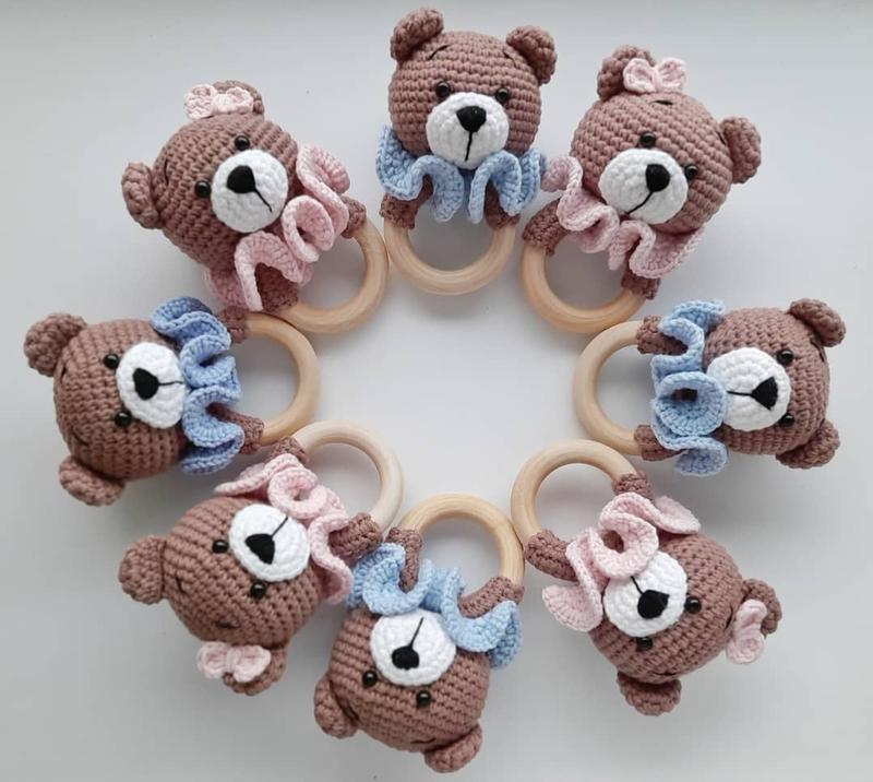 🧶 погремушка для малыша – мишка создан с заботой🧶 Ищете особый подарок для новорожденного? Вязаное крючком погремушка в виде милого мишки – идеальный выбор! ✨ Особенности игрушки: Материалы: Экологически чистая хлопковая пряжа, деревянная ручка-кольцо, наполнитель из гипоаллергенного холлофайбера. Дизайн: Вы можете выбрать мишки-мальчика или мишки-девочку – с бантиком, цветочком или другим милым аксессуаром. Безопасность: Все детали прочно закреплены, что делает игрушку абсолютно безопасной для малыша.оси на безопасном креплении или вышитые по желанию, нос вышит. 🎨 Цвета: Пастельные оттенки кофейного, розового, голубого, бежевого или по вашему желанию. 🔔 Погремушка: Внутри скрыт нежный колокольчик, звук которого понравится малышу и поможет развивать слуховые навыки. Эта игрушка не только развлечение, но и важный элемент сенсорного развития малыша. Мишка станет первым другом ребенка, а вы получите удовольствие от радостных улыбок младенца.