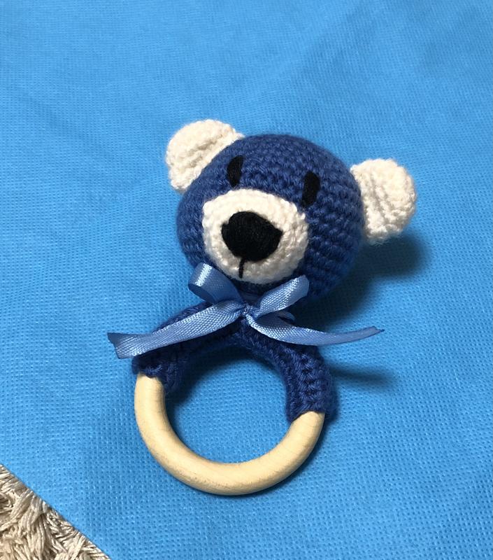 В'язана іграшка-брязкальце - медведик, на дерев'яному кільці