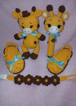 набір складається з іграшки, брязкальця, тримача для соски, босоніжок. все зв'язано із гіпоалергенної бавовни турецького виробництва, наповнювач холофайбер. всі деталі надійно закріплені, очі на безпечному кріпленні. брязкальце виконано на в'язаній річці, щоб краще тримали малюки, всередині торохтілка. набір підходить як дівчинці так і хлопчику. можна на замовлення виготовити в іншому кольорі, або з іншим наповненням. можна придбати кожну деталь окремо, або якусь частину набору. босоніжки застібаються на ґудзик, можно пережити ґудзик під вашу ніжку. підошва двойна, м'яка, всередині полістирол.