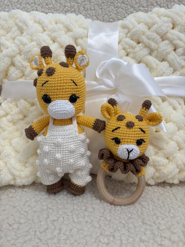 Пледик 90*80 , брязкальце жирафчик і іграшка жирафчик виготовлений з якісної пряжі, з любов’ю подарує тепло і затишок малюку