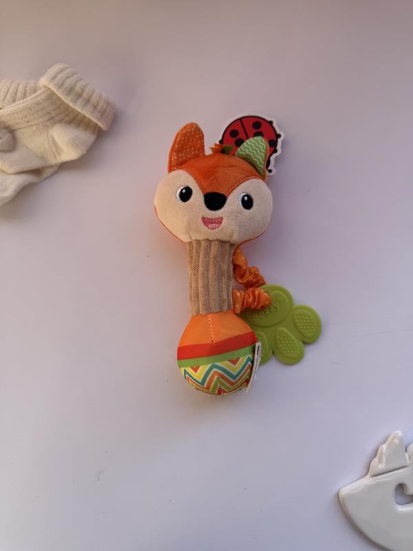 Детская мягкая игрушка-погремушка в виде милого лисенка. Игрушка выполнена в ярких оранжевых и зеленых цветах, привлекающих внимание малыша. Голова лисенка мягкая, с вышитыми глазами и улыбкой. Ручка с ребристой текстурой удобно ложится в маленькую детскую руку. Нижняя часть украшена разноцветным узором в виде зигзагов. На стороне игрушки есть зеленый прорезыватель в виде лапки, который помогает уменьшить дискомфорт при прорезывании зубов. Шуршащие элементы для сенсорного развития. Игрушка способствует развитию мелкой моторики, сенсорного восприятия и координации движений. Она легкая, безопасная и подходит для младенцев. ⚪️Цена: 250 грн