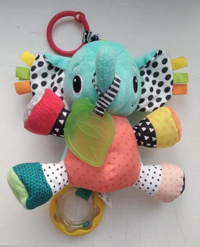 Infantino игрушка подвеска слоник для малыша в отличном состоянии. Внутри звенит колокольчик, есть погремушка, ушки ножки, ручки - шуршат, листочек - прорезыватель. Замеры на фото