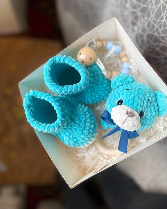 Набор на выписку, крестины или просто так в гости к новорожденному мальчишке Пинетки и погремушка Пинетки - 11 см по стопе (до 1 года) Погремушка на деревянном колечке, не голосовой звук выгорания Тримач для пустушки